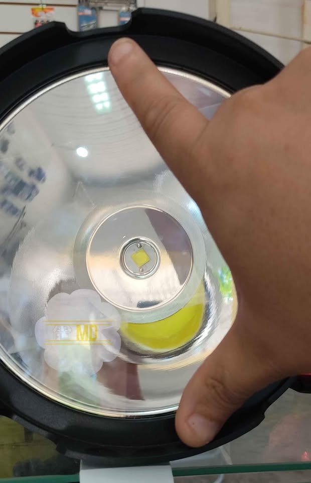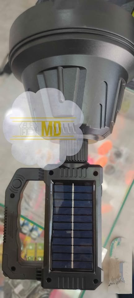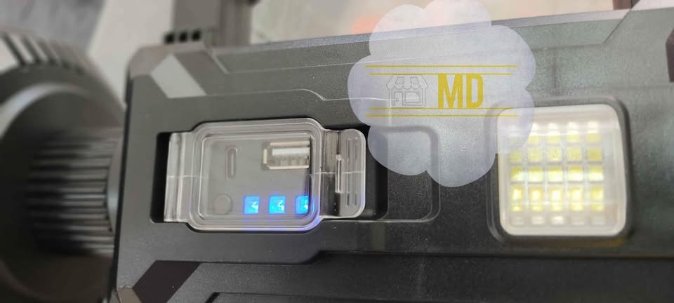 Foco con buena potencia, tres intensidades de luz frontal, dos intensidades de luz lateral, también función luz roja y azul parpadeante como sirena, con power bank, podés cargar tu celular. Es recargable, solar (cuenta con panel solar), también a corriente 220V con un adaptador de 5V (no incluido, viene solo el cable). El foco principal mide alrededor de 19 cm.
