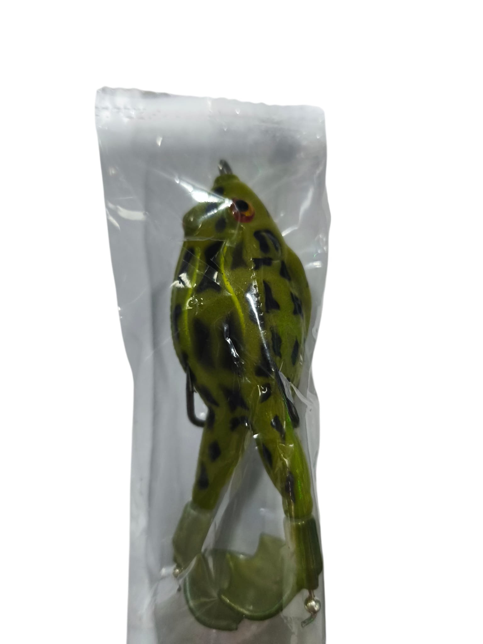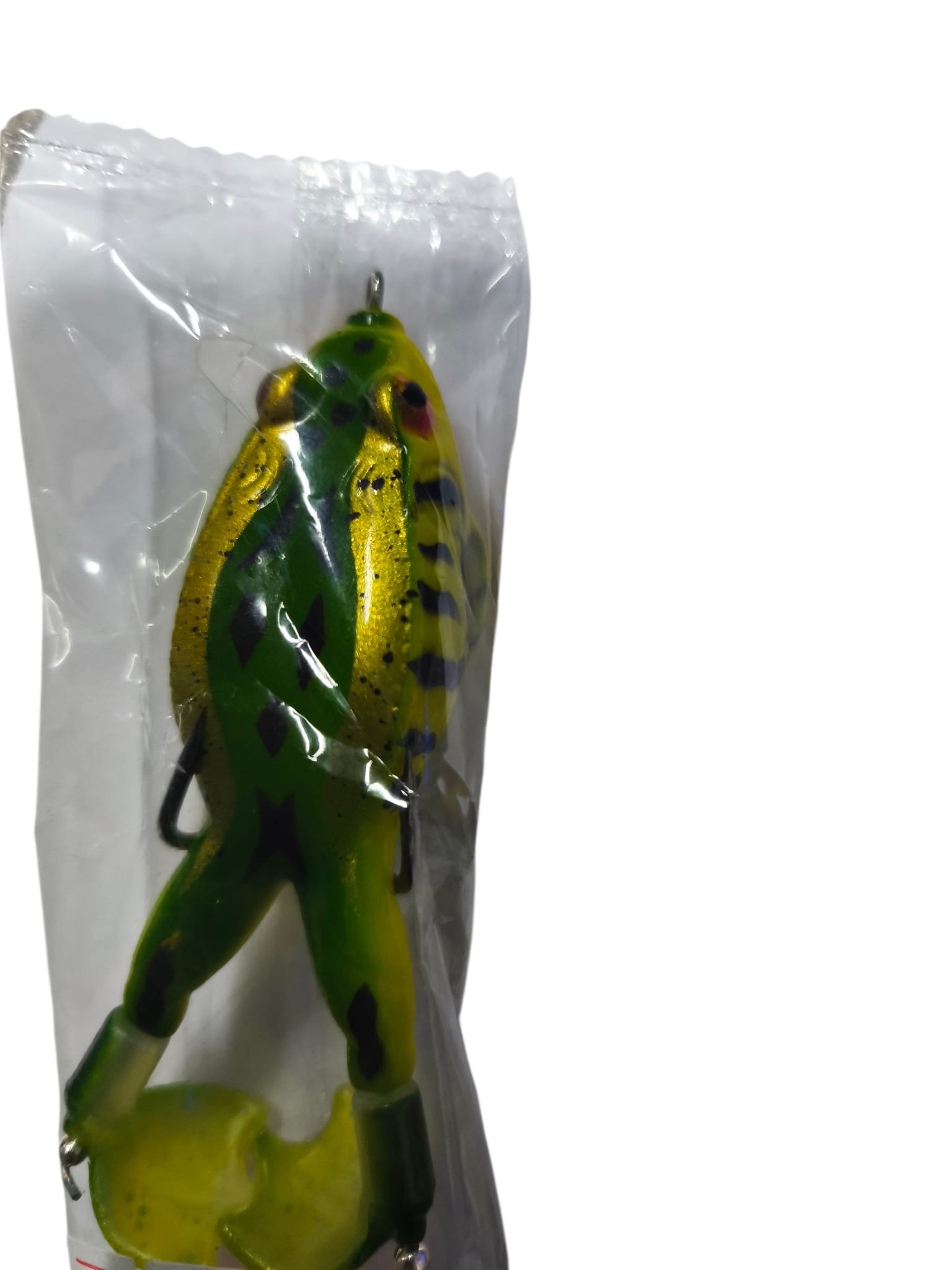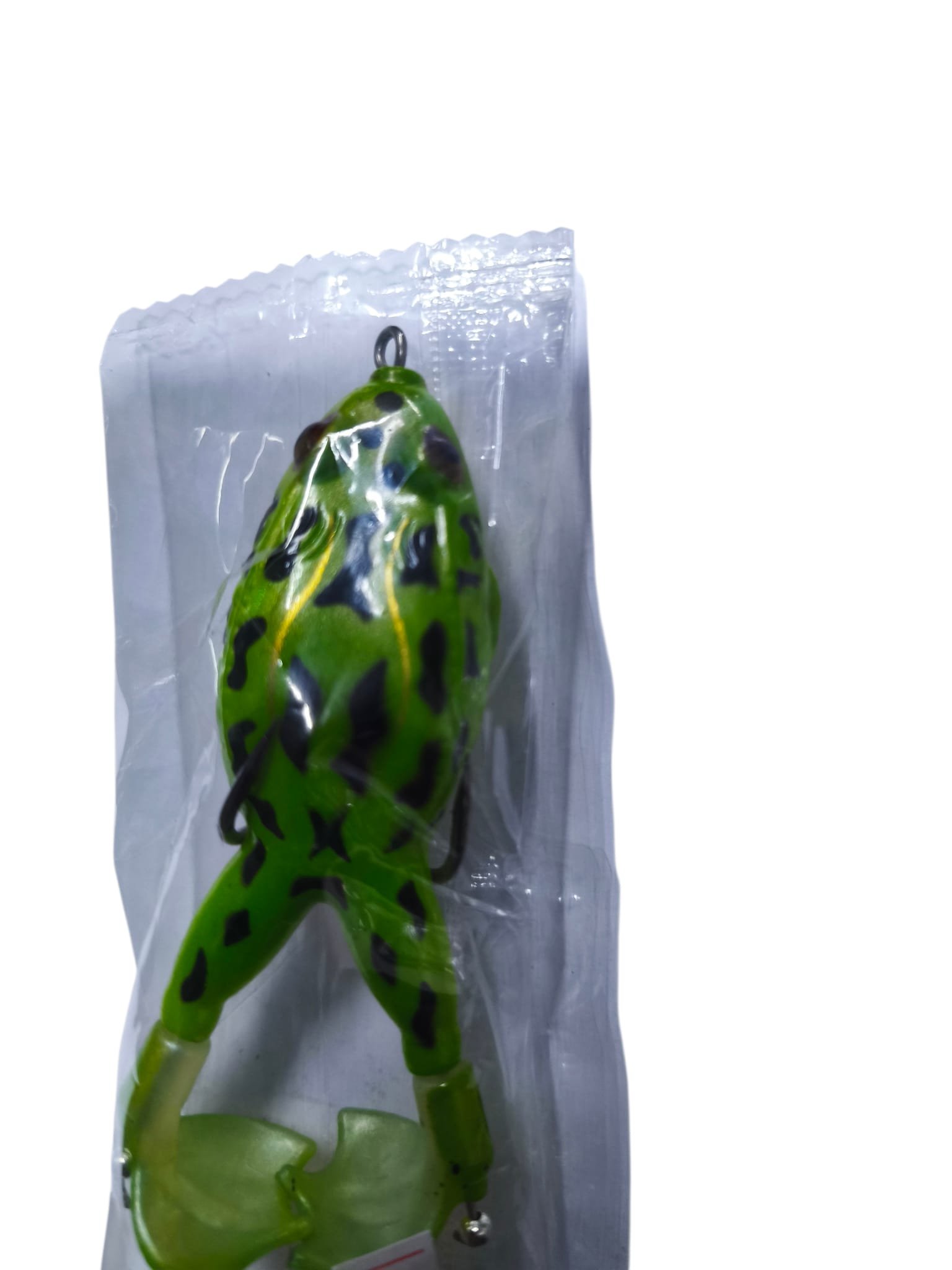 Señuelo de pesca tipo rana (frog) de superficie, equipado con patas giratorias que generan vibración y movimiento constante durante la recuperación.